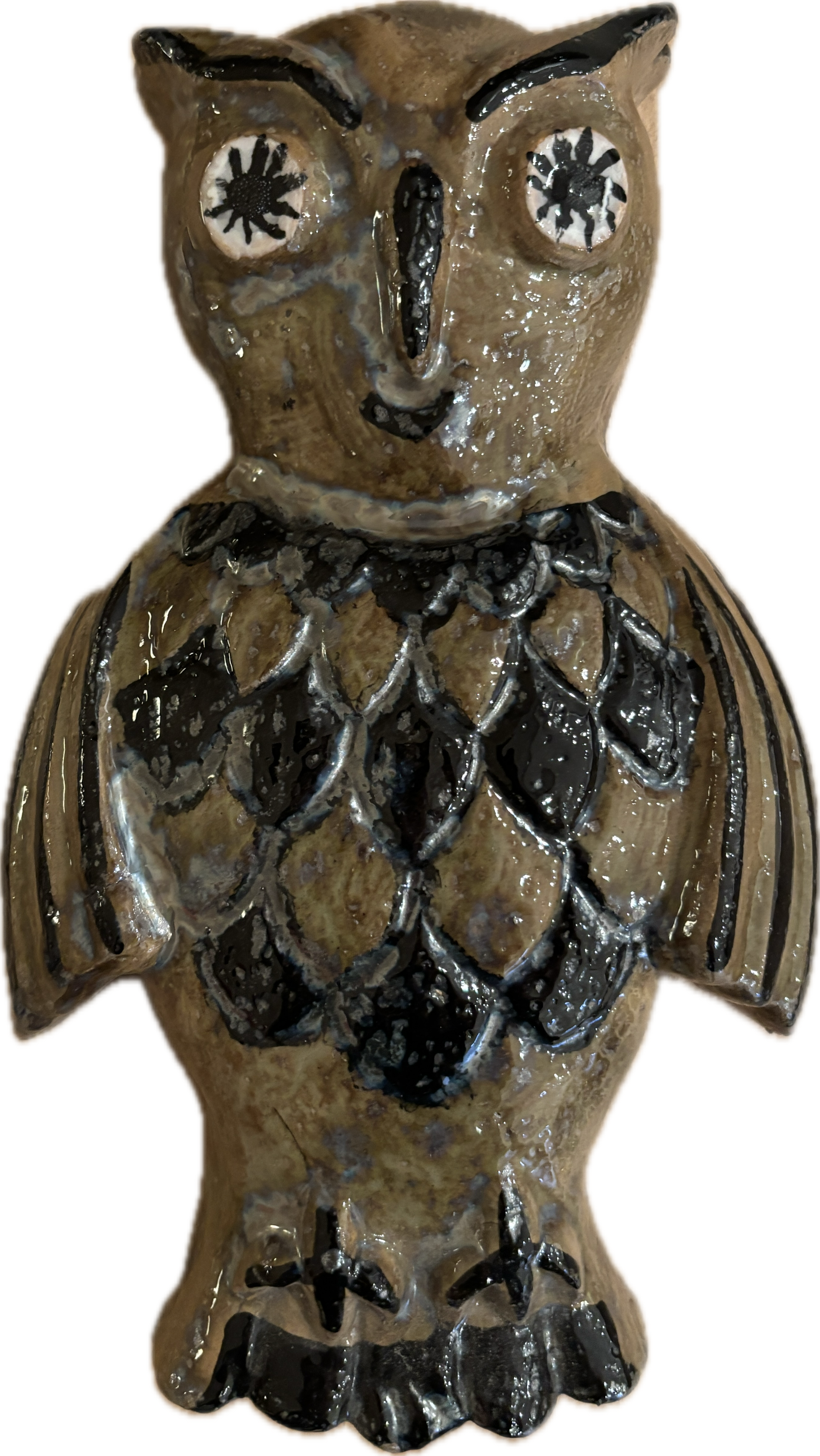 Eftertragtet og håndlavet keramisk ugle fra Mallorca med grågrøn og sort glasur