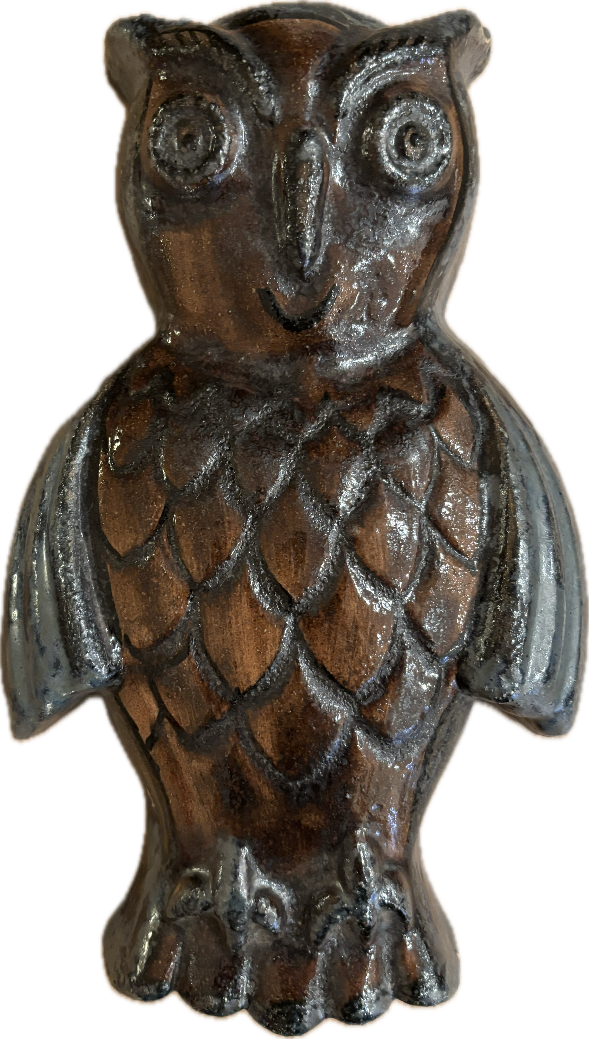 Eftertragtet og håndlavet keramisk ugle fra Mallorca med grå og brun glasur
