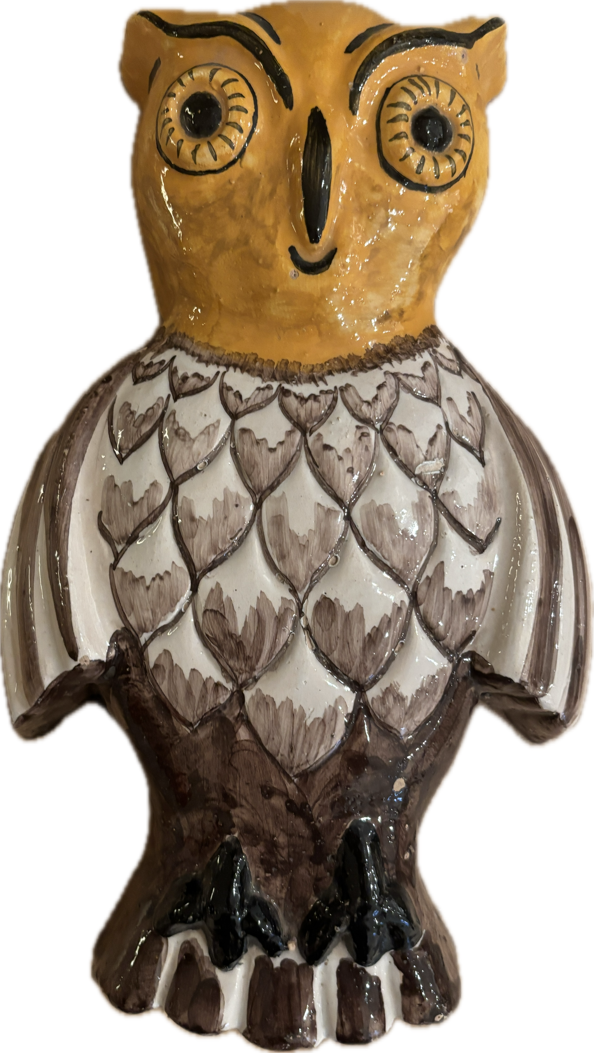 Eftertragtet og håndlavet keramisk ugle fra Mallorca med gul, hvid og brun glasur